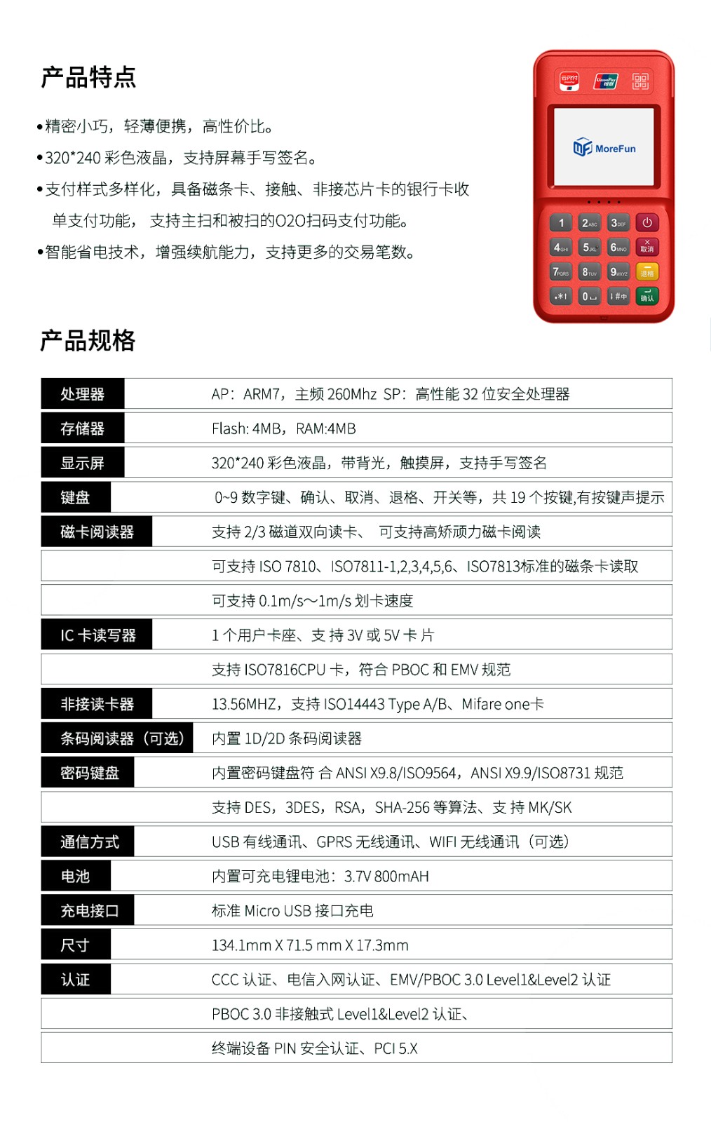 首页>>迁西产品中心>>迁西手持无线POS 迁西联动优势-优POS Pro 高配版 * 性能优越:32位高性能ARM11安全CPU;整机通过业内更先进的PCI PED4.X 安全认证及国内受理终端PIN输入设备安全评估检测认证,多项措施保障金融交易的安全;* 时尚外观:外形小巧携带方便,高抗跌落性能、宽工作温度、防水防尘设计、外壳坚固耐刮、户外携带式作业更加耐久可靠。* 通讯备份:支持2G-3G扩展;* 超长续航:3.7V-800毫安稳定续航能力,智能电池管理保证持续工作18小时,待机72小时。 标准配置 返 回